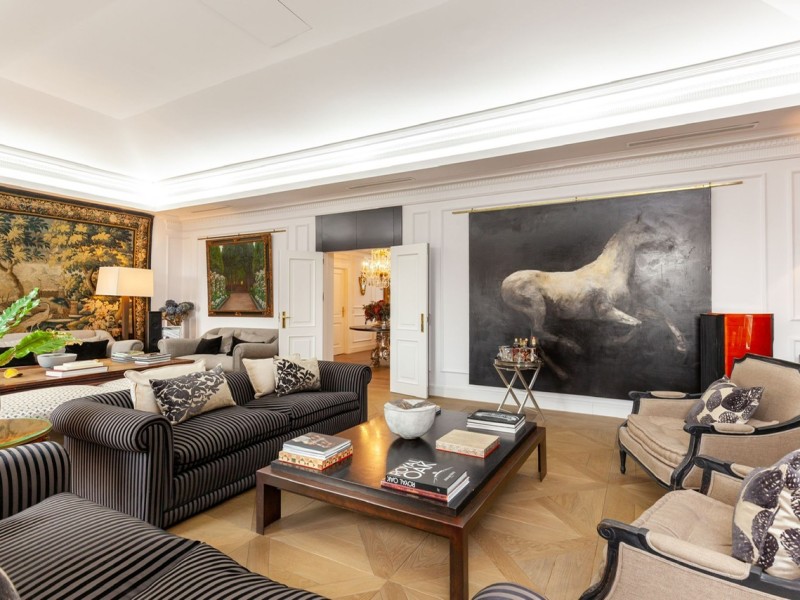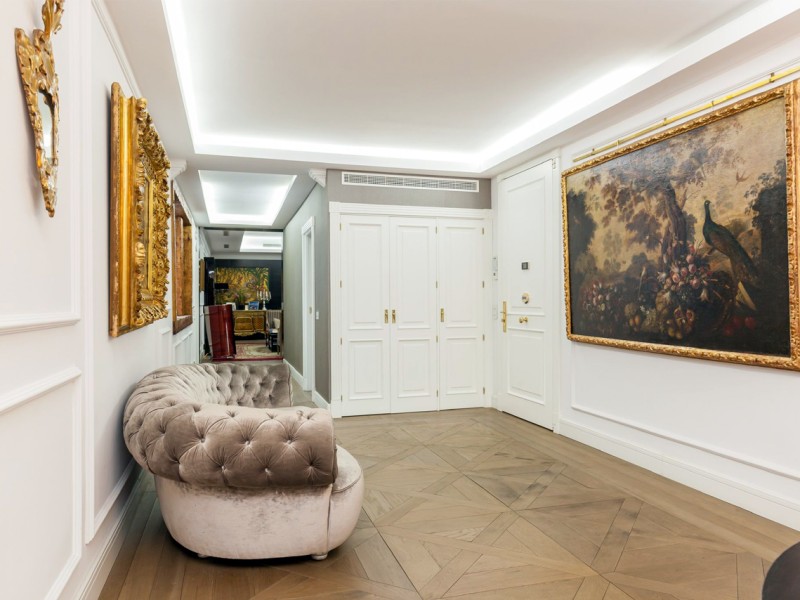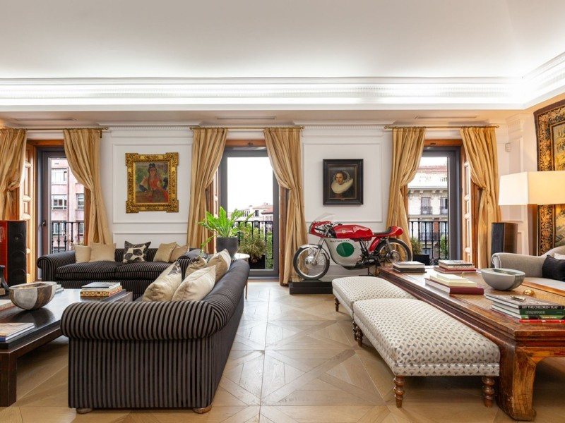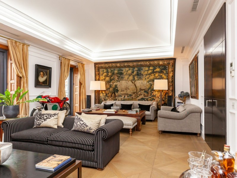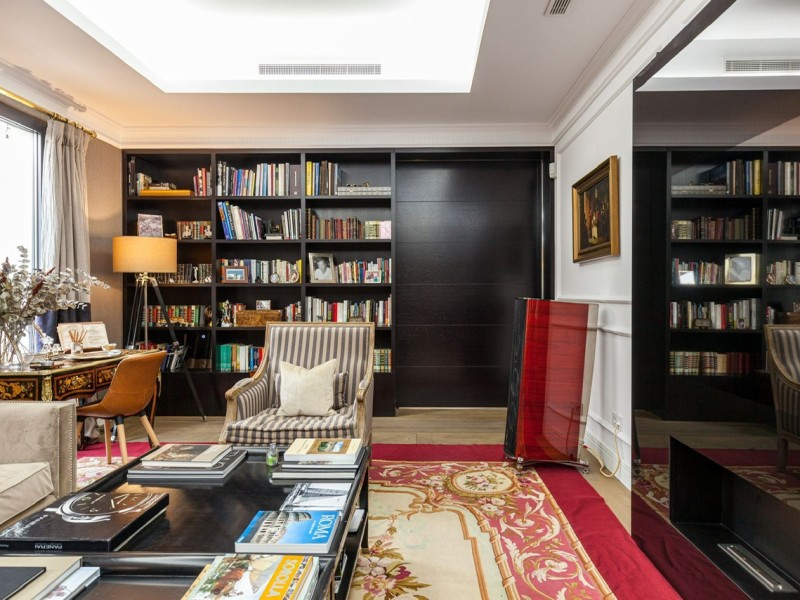 Exclusive property for sale in Madrid. In the neighborhood of Justicia, in one of its most representative streets, we find this duplex penthouse of 707m2 renovated and decorated with excellent materials and exquisite taste. Spacious entrance hall differentiating the 2 parts of the house. On the left hand side courtesy toilet, large living room with 3 balconies overlooking the street with spectacular views of the Ateneo de Madrid and Justice area. Living room with integrated cinema in the ceiling, large windows, elegant moldings and double door access. Ceilings of 3 meters. In this part of the house master bedroom with bioethanol fireplace, front closets, 2 independent hardwood dressing rooms and bathroom with bathtub and shower. In this same wing of the house there are two other double bedrooms, which share a full bathroom. From this side of the house there is access to one of the upper floors by stairs to another space currently used as a living room. by stairs to another space currently used as a gym with a full bathroom and a sauna, attic type which is another bedroom space. On this same upper floor there is another room prepared as a dressing room, and a storage space of more than 50m².