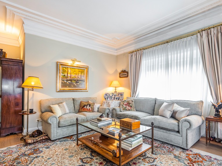 The living room has two orientations, all these rooms with classic windows of the time but modernized with new materials for proper insulation. High ceilings with moldings created with exquisite taste. In the sleeping area we find four bedrooms, two of them en suite, highlighting the master bedroom with a large bathroom and dressing area. Another full bathroom available to the other two bedrooms is located in this area. The kitchen has well differentiated the office area of the kitchen area and has a large window kitchen and has a large window overlooking the open courtyard. Currently the office area is supplied with more cupboard capacity, but it is easily recoverable without work. The house has a guest toilet and a private elevator that goes directly to the house with private security.